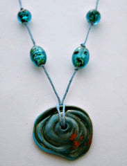 Type: Necklace - BeadedThis unique necklace will a fun to many outfits. It has a hand-made center glass ring with accent glass beads and comes with 16 inch all natural cording with a silver toggle clasp.