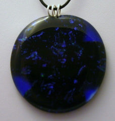 Type: PendantThis piece is dark purple with a black/ blue background. It is a large piece but a bit more suttle. It is almost 2 inch square. A fine silver bail has been fired into the piece. It comes with an 18 inch black leather cord.