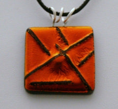 Type: PendantThis fun dichroic pendant will go well with browns, oranges, and reds. It has a fine silver bail fired into the piece and is 1 1/8 inches square. It comes with an 18 inch black leather cord.