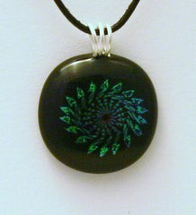 Type: PendantThis pendant has a cool circular saw shaped design of dicroic in the center. It has a fine silver bail fired into the piece and comes with an 18 inch black leather cord. approximately 1 inch round