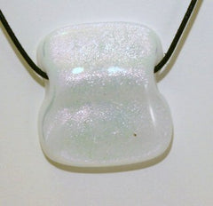 Type: PendantThis free flowing pendant has just a shimmer of sparkle. It has a pass through for the necklace and comes with an 18 inch clear rubber cord. 1 1/2 inches square.