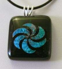 Type: PendantBe blown away with this pinwheel pendant! A fine silver bail has been fired into the piece. It comes with an 18 inch black leather cord and is approximately 1 inch square.
