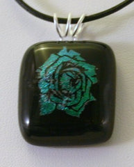 Type: PendantThis cool colored rose pendant is pretty as its petals! A fine silver bail has been fired into the piece. It comes with an 18 inch black leather cord and is approximately 1 inch square.