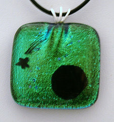 Type: PendantShoot for the stars. This pendant has been hand painted and has a fine silver bail fired into the piece. It comes with an 18 inch black leather cord. 1 3/8×1 1/4 inches long