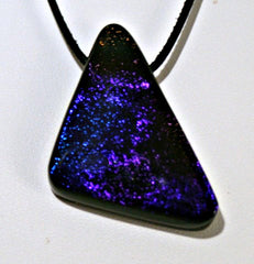 Type: PendantThis tri-angular dichroic pendant with its purple/blue sparkle would accent any outfit well. It has a pass though for the necklace and is 1 1/4×1 1/2 inches long. It comes with an 18 inch black leather cord.