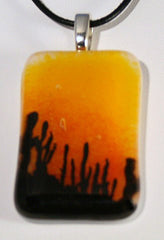 This abstract scene pendant is lots of fun. It is hand painted and the background runs from an orangy red to bright yellow. This piece is fired four times to achieve the end result and comes with an 18 inch black leather cord.1×1 1/2 inches long.