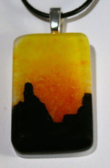 Type: PendantThis abstract scene pendant is lots of fun. It is hand painted and the background runs from an orangy red to bright yellow. This piece is fired four times to achieve the end result and comes with an 18 inch black leather cord.1×1 1/2 inches long.