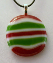 Type: PendantAre you in the Christmas Spirit? Well get into it with is red, green and white fused pendant. It is almost 1 1/2 inch square. It comes with an 18 inch black leather cord.