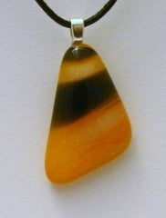 Type: PendantThis vibrant orange pendant with white and deep purple stripes (that are almost black looking) could be worn for Halloween as well as year round. It comes with an 18 inch black leather cord. 7/8×1 1/8 inches long