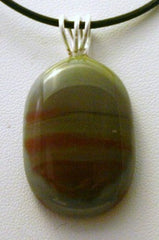 Type: PendantThis bizarre pendant is a cool shade of grey with reddish brown and black stripes and is far prettier than the photograph. A fine silver bail has been fired into the piece and comes with an 18 inch black leather cord. 7/8 x 1 1/4 inches long.