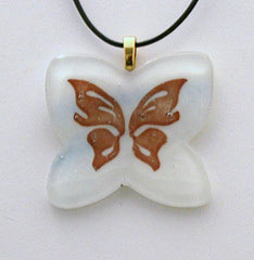 Type: PendantThis beautifully shaped butterfly pendant is perfect for everyday wear with a subtle hint of blue in the background. It has been fired 3 times and is 1 3/4 inches square. It comes with an 18 inch black leather cord.