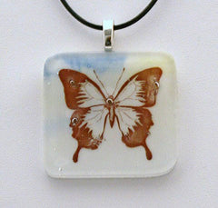 Type: PendantThis beautifully shaped butterfly pendant is perfect for everyday wear with a subtle hint of blue and yellow in the background. It has been fired 3 times and is 1 1/2 inches square. It comes with an 18 inch black leather cord.